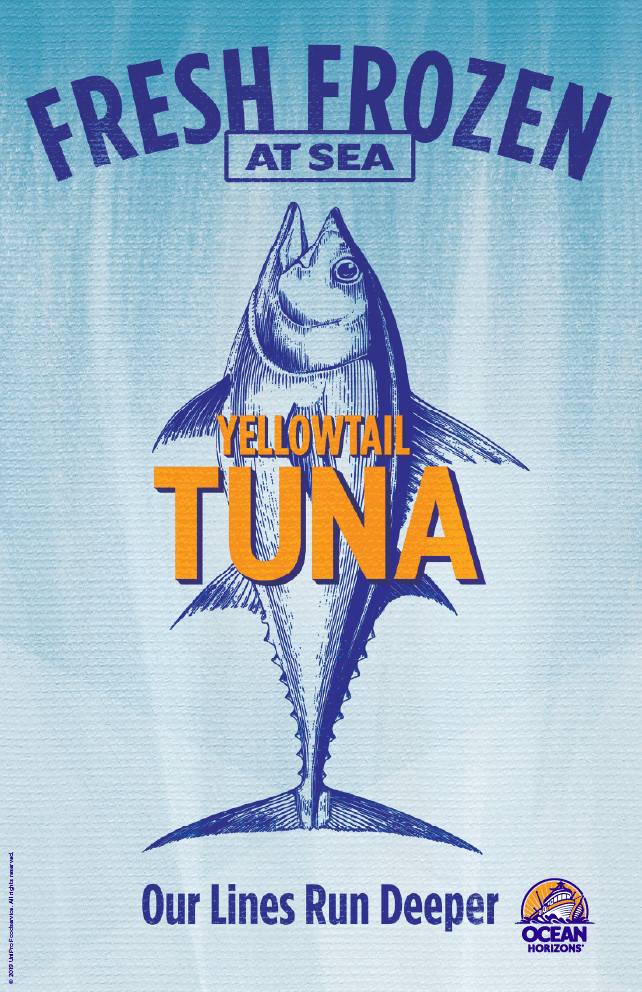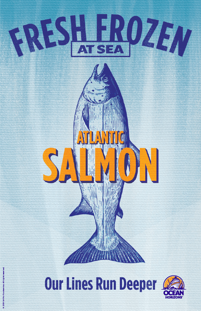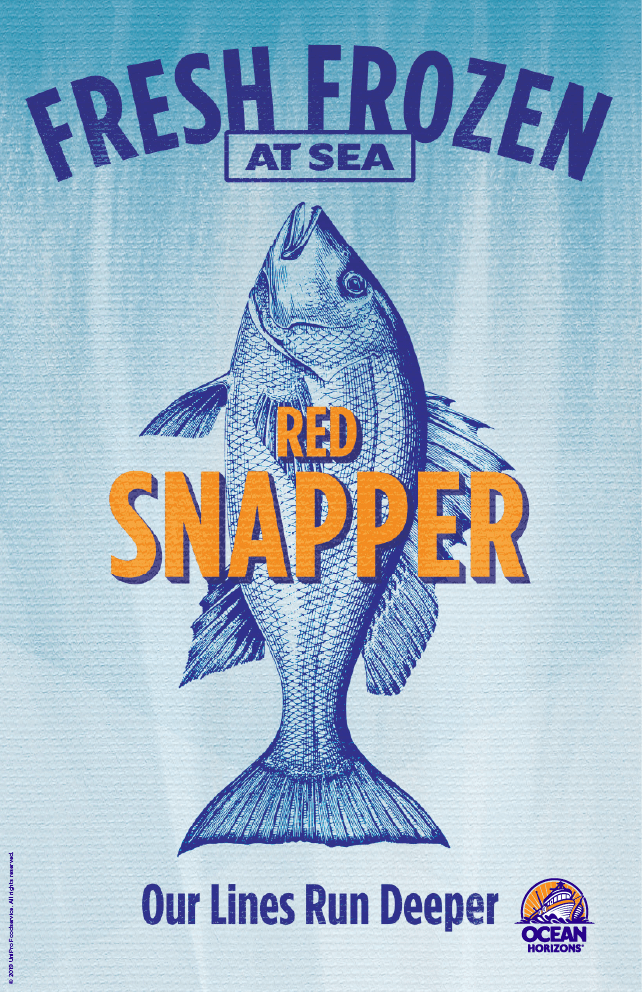 Fish species illustrations are used as design support in Ocean Horizons packaging and marketing.